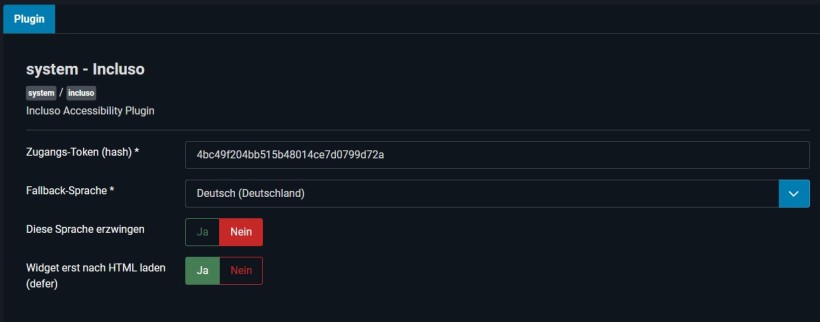 Um das Widget auf einem Joomla!-System zu integieren, können Sie das Incluso Joomla-Plugin verwenden, welches mit Joomla! 4, 5 und 6 kompatibel ist. Dieses wird zunächst als Zip-Archiv auf Ihrer Joomla!-Umgebung installiert. Anschließend müssen Sie das Plugin aktivieren, die Plugin-Einstellungen öffnen und das Zugangstoken eintragen. Nun wird das Widget auf Ihrer Webseite angezeigt.